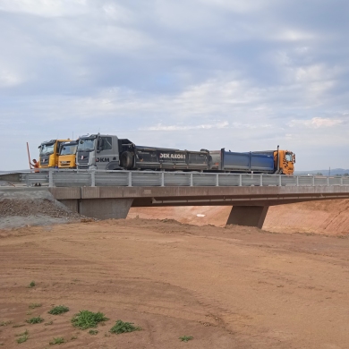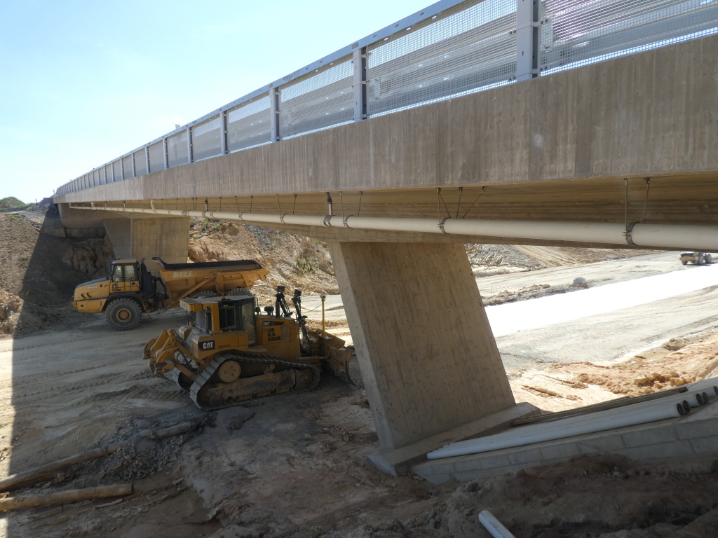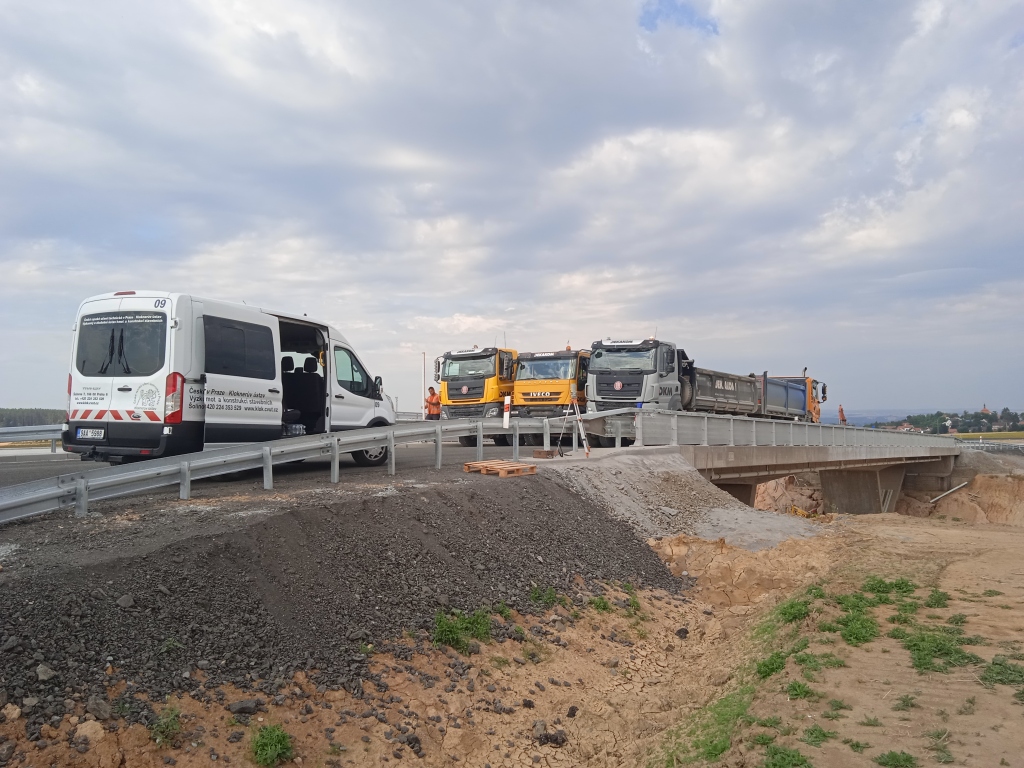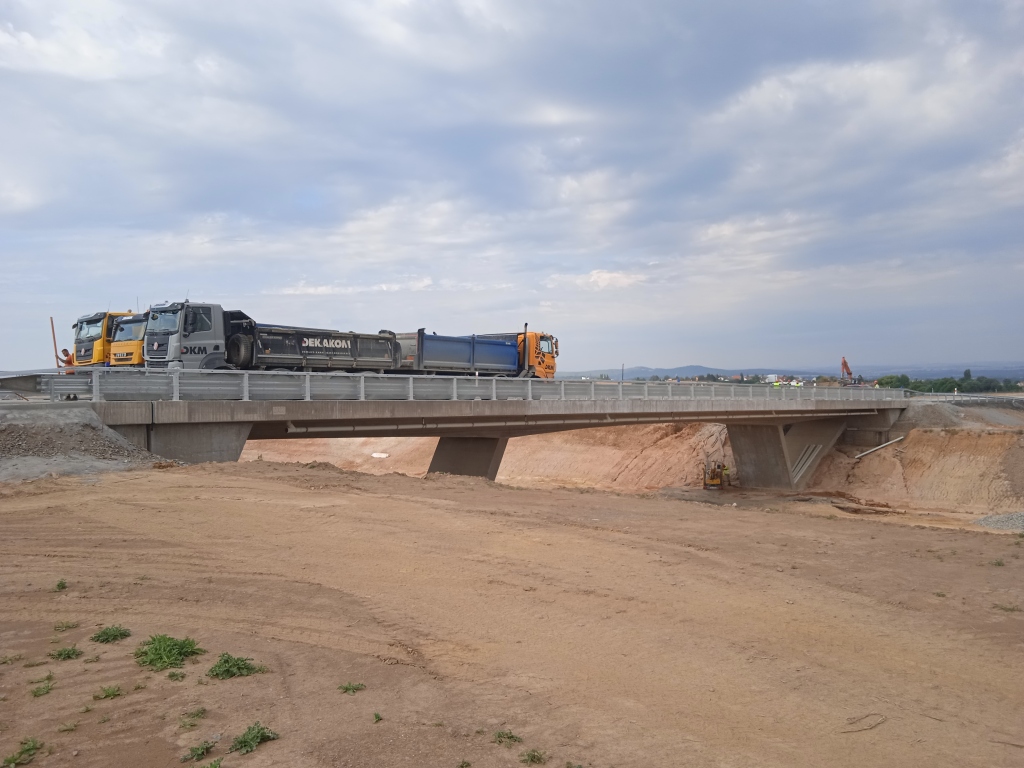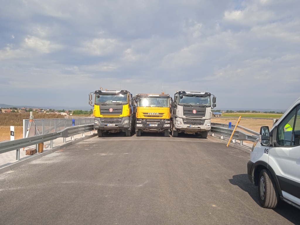 Kliknutím obrázek zvětšíte – Zatěžovací zkouška mostě přes I/27 – pohled na most od opěry 1 vlevo. Kliknutím obrázek zvětšíte – Zatěžovací zkouška mostě přes I/27 – zatížení v 1. poli. Kliknutím obrázek zvětšíte – Zatěžovací zkouška mostě přes I/27 – zatížení v 1. poli. Kliknutím obrázek zvětšíte – Zatěžovací zkouška mostě přes I/27 – zatížení v 1. poli.